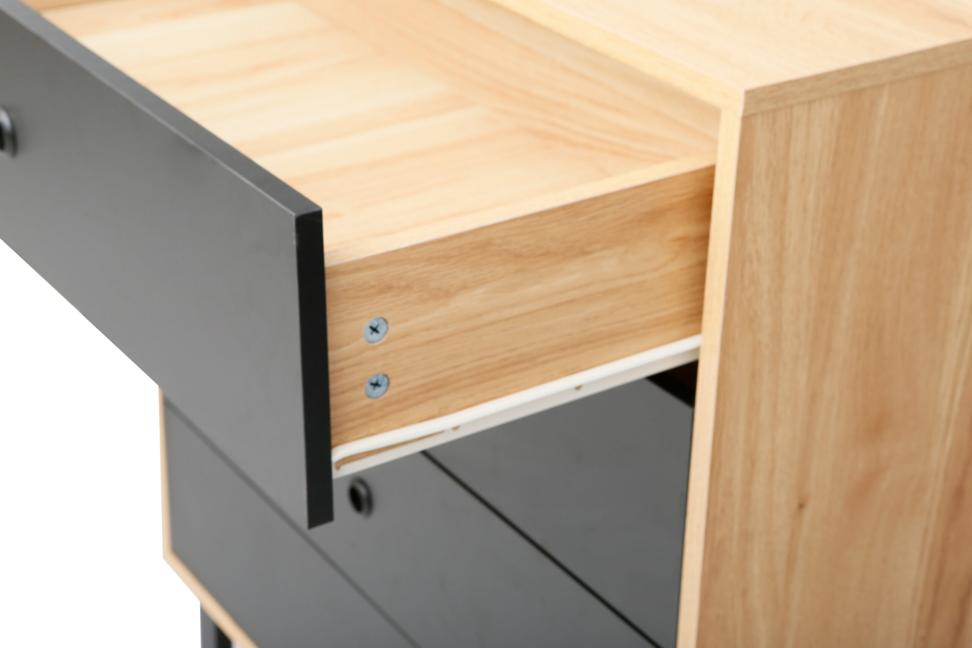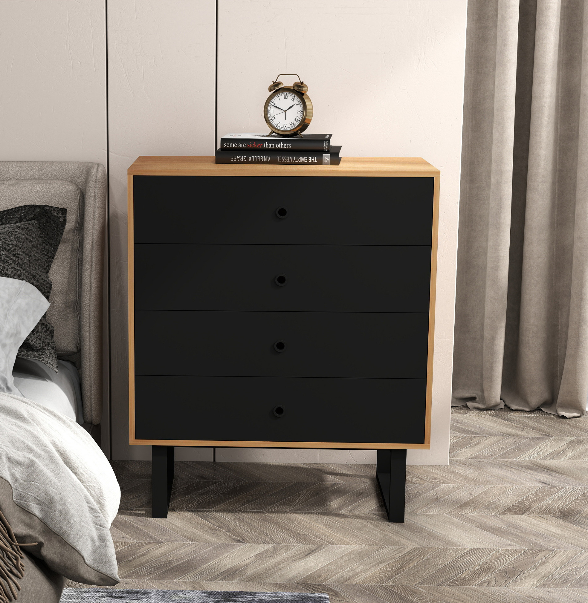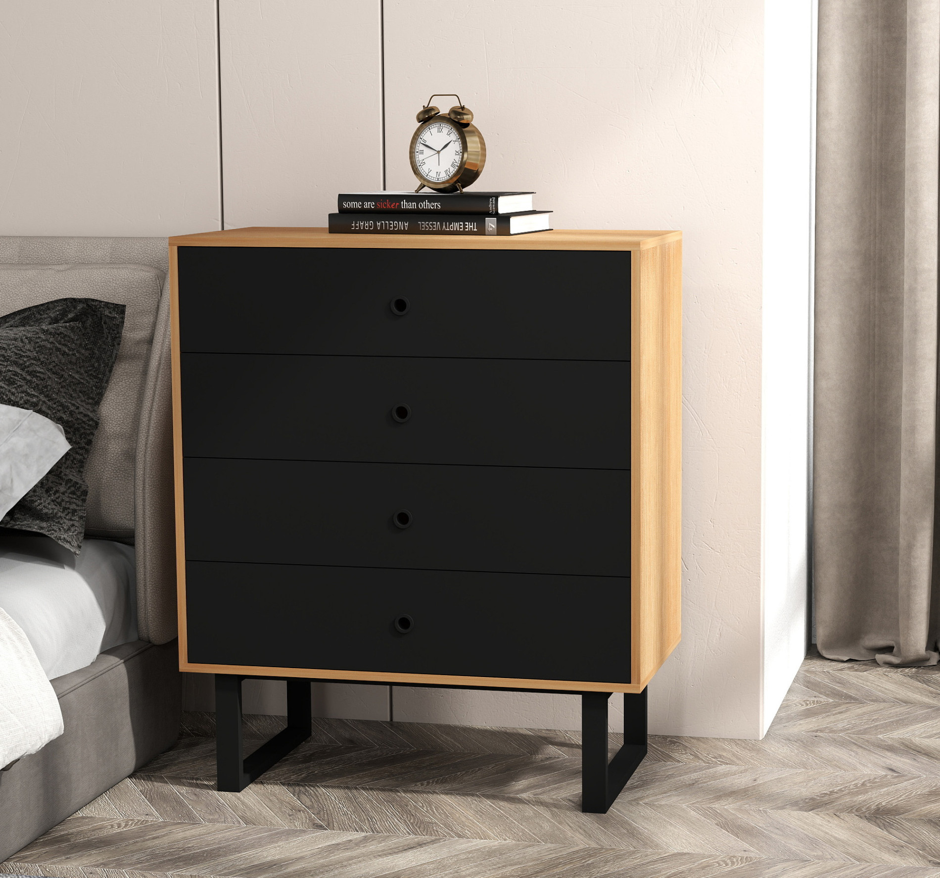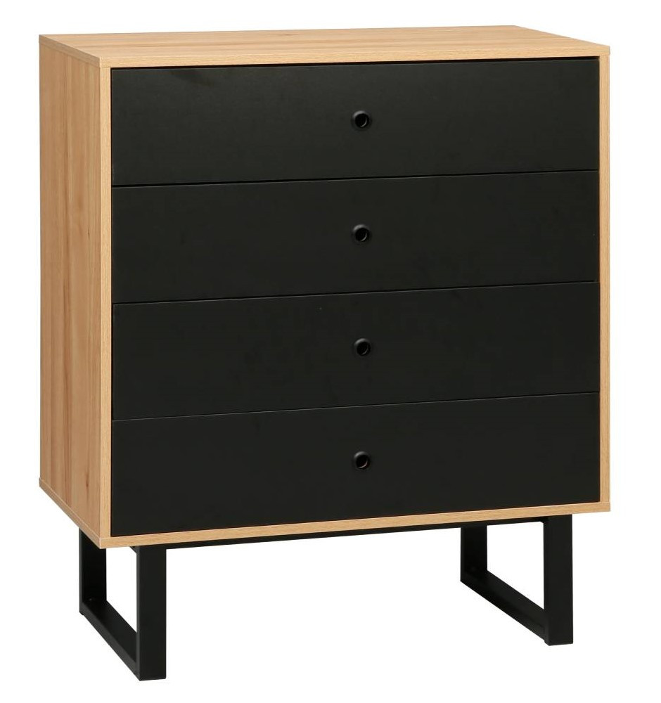 Structura este susținută de un cadru metalic vopsit în câmp electrostatic, oferind rezistență sporită și protecție împotriva uzurii. Comoda este prevăzută cu 3 sertare spațioase, ideale pentru depozitarea obiectelor personale și a accesoriilor.