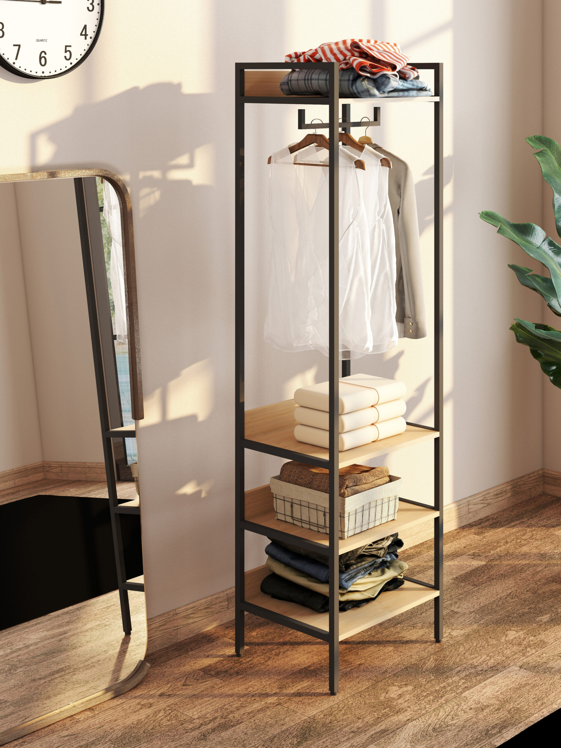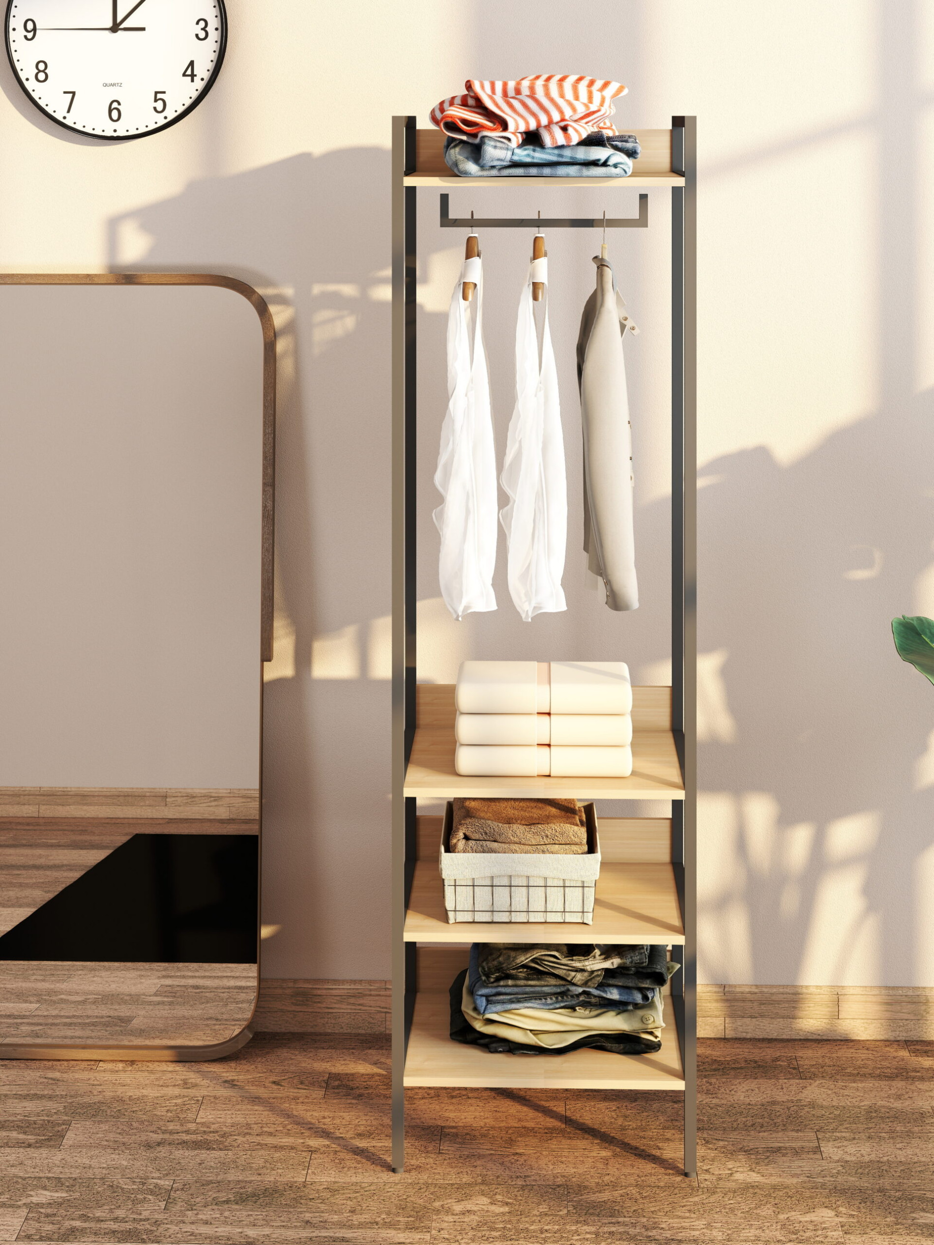 Cele patru niveluri permit depozitarea ordonată a diverselor obiecte — de la haine pliate până la cutii, genți sau încălțăminte. Designul deschis menține încăperea aerisită, asigurând în același timp o capacitate mare de depozitare.