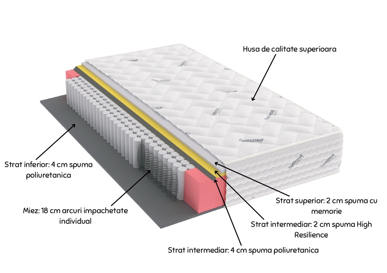 - Suport și flexibilitate în timpul somnului. Coloana vertebrală va primi sprijinul necesar, iar mușchii corpului se vor putea relaxa corespunzător. Punctele de presiune sunt eliminate mulțumită stratului de memory foam de 2 cm care ajută la amplificarea circulației sangvine.