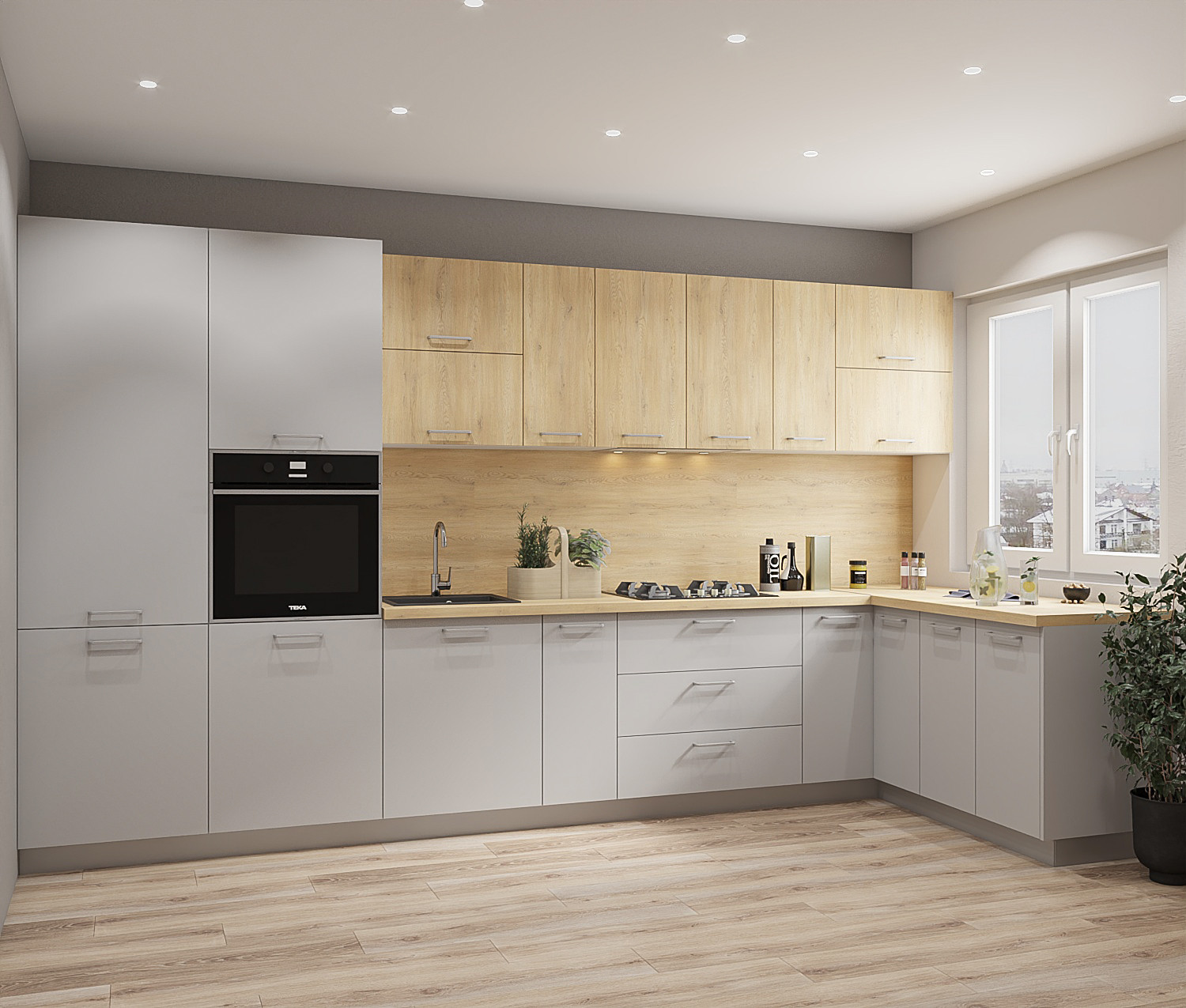 Relaxe Corner Silva este definiția eleganței moderne și a unei de eficiențe spațiale superioare. Această bucătărie pe colț de 3,8 x 1,62 metri a fost concepută pentru a aduce un aer contemporan și sofisticat în locuința ta, mizând pe o paletă de culori neutră care maximizează senzația de spațiu și luminozitate. Fațadele cu textură nobilă de stejar, puse în valoare de blatul asortat și accentele rafinate de gri ale modulelor inferioare, transformă zona de gătit într-un punct central al designului interior.