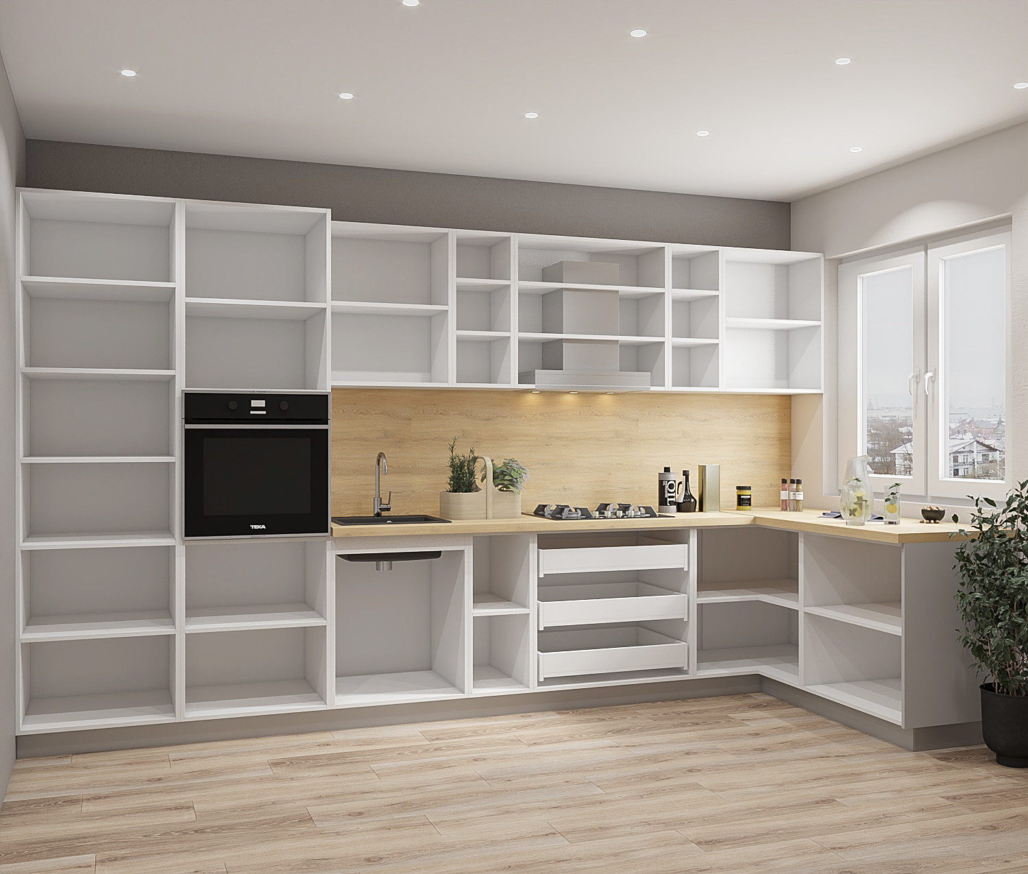 - Organizare Simetrică: Configurația pe colț este optimizată pentru a oferi un flux de lucru ergonomic pe o lungime generoasă, facilitând integrarea optimă a zonelor de depozitare și preparare.