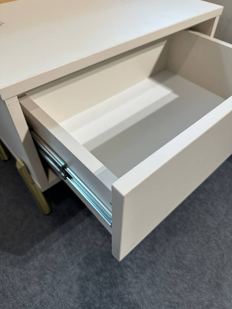 Corpul noptierei este realizat din PAL de înaltă calitate, clasa E1, cu grosimea de 18 mm, oferindu-i un aspect elegant și modern. Frontul se deschide fără mâner datorită mecanismului tip-on GTV, asigurând acces comod la spațiul interior. Pentru o utilizare confortabilă, noptiera este dotată cu ghidaje telescopice push-on.
