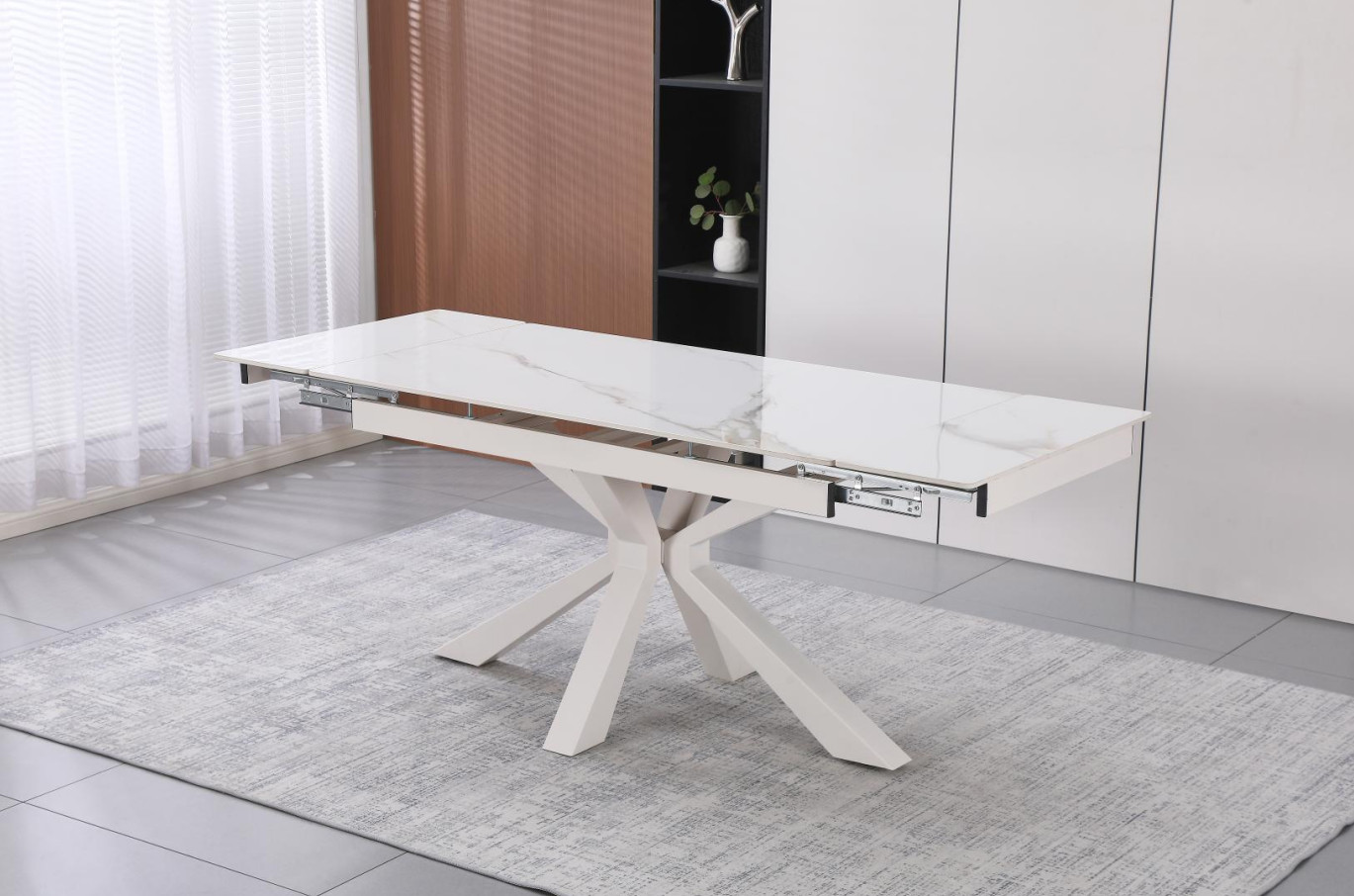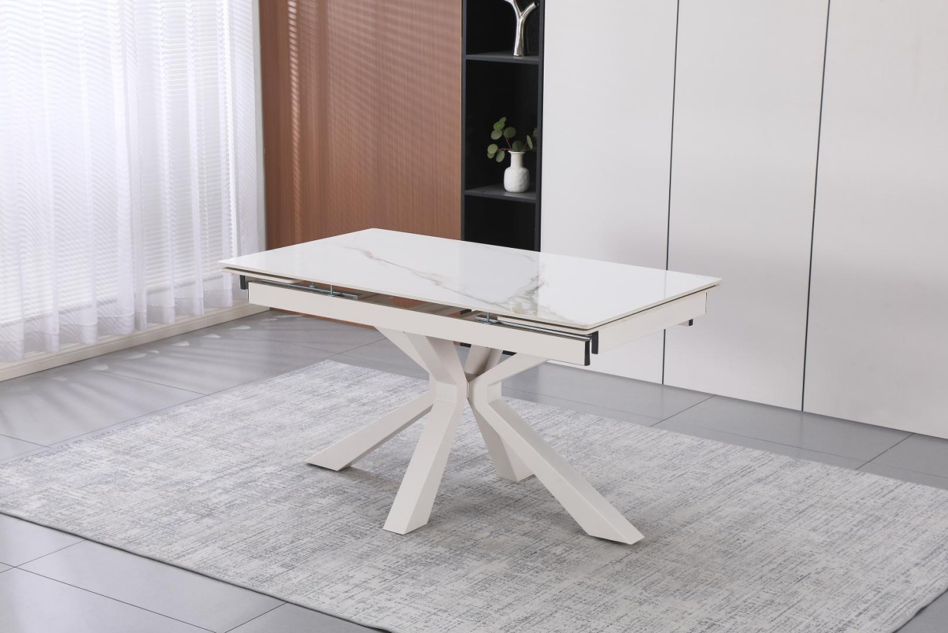 Masa extensibilă DT-2426 impresionează prin funcționalitate și un design industrial rafinat. Blatul din ceramică este extrem de rezistent și ușor de întreținut, oferind o suprafață elegantă ce se extinde de la 140 cm la 200 cm pentru a găzdui mai mulți oaspeți. Picioarele din metal, finisate cu vopsea pulbere neagră, asigură durabilitate și o stabilitate excelentă. Cu o lățime de 80 cm și o înălțime de 75 cm, această masă este piesa ideală pentru un dining modern, adaptându-se ușor nevoilor tale.
