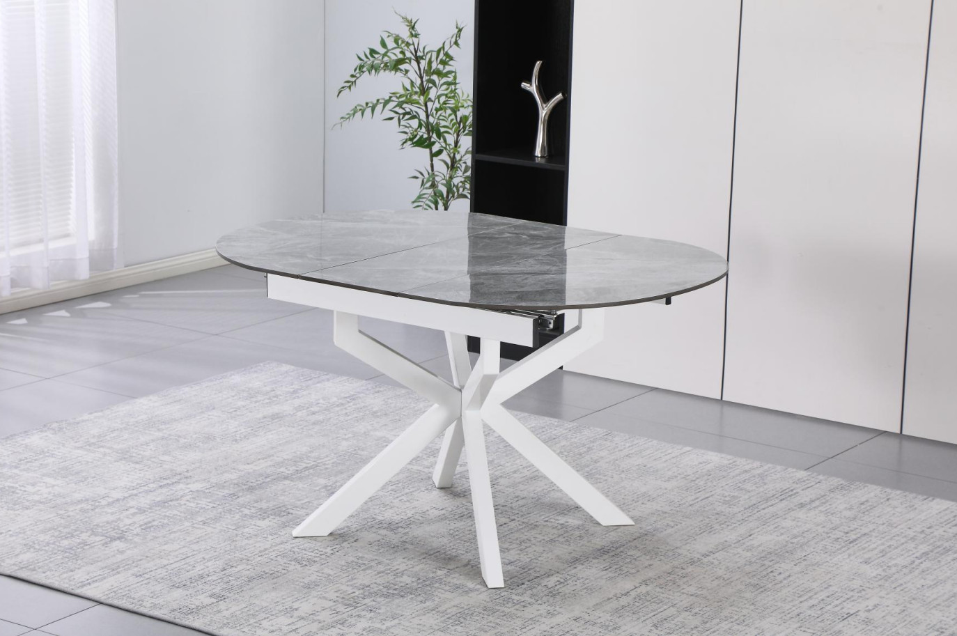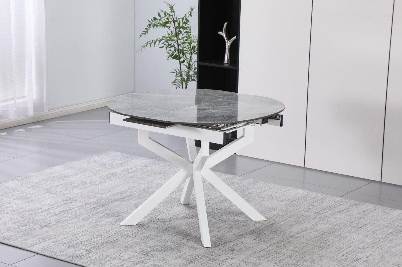 Masa extensibilă DT-2522 îmbină utilitatea cu designul modern. Cu un diametru inițial de 100 cm, aceasta se extinde cu încă 30 cm, oferind spațiu suplimentar la nevoie, având o înălțime standard de 76 cm. Picioarele metalice albe, finisate prin vopsire, asigură o stabilitate excelentă și un aspect curat, minimalist. Este o soluție versatilă și elegantă, ideală pentru a optimiza spațiul în orice sufragerie sau bucătărie contemporană, fiind ușor de integrat în diverse decoruri.