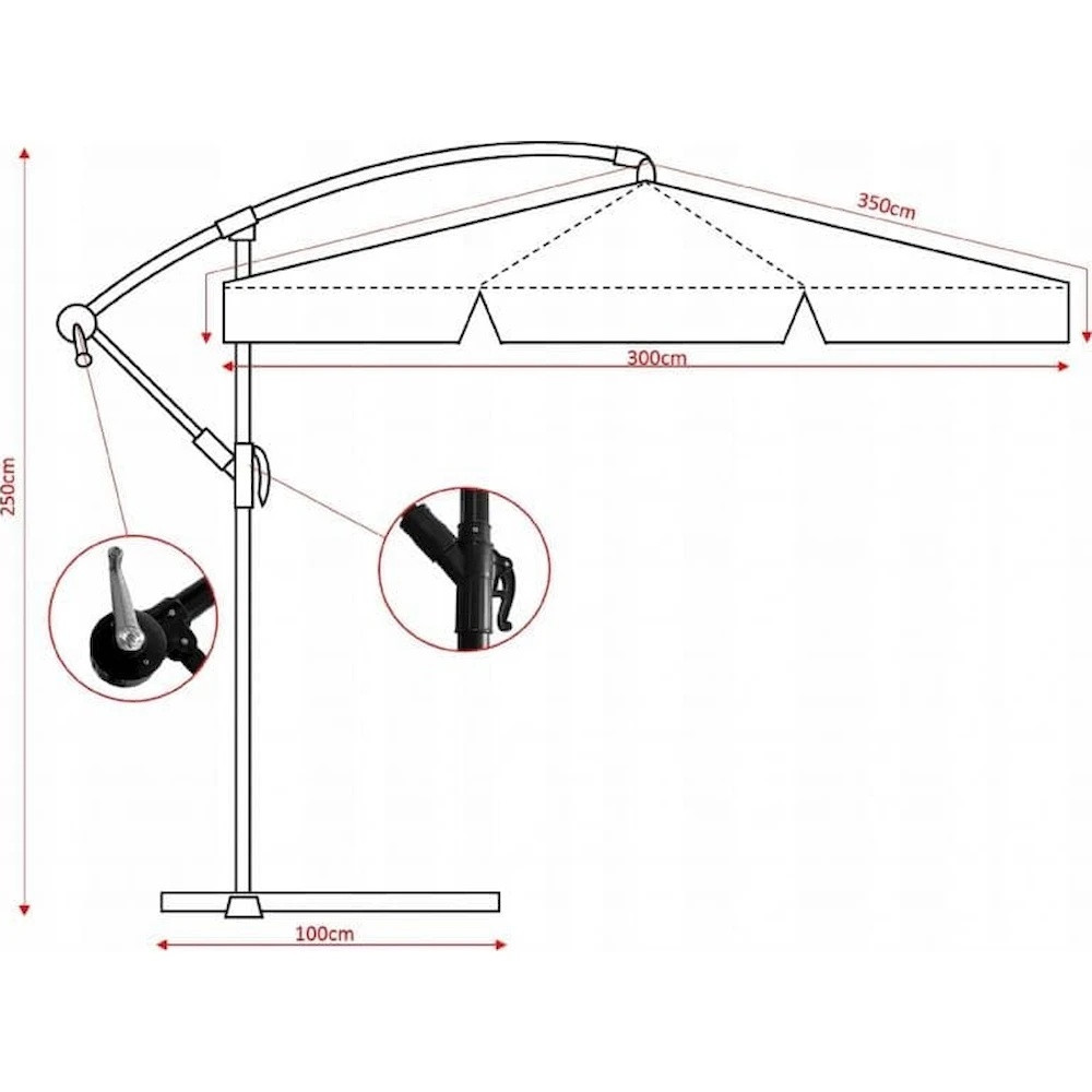 Modelul oferă o flexibilitate sporită prin reglarea înălțimii, până la maximum 250 cm, și posibilitatea de a înclina baldachinul. Setul este complet, incluzând suportul necesar pentru stabilitate și o husă practică pentru depozitare. Designul funcțional o face ideală pentru orice terasă modernă.