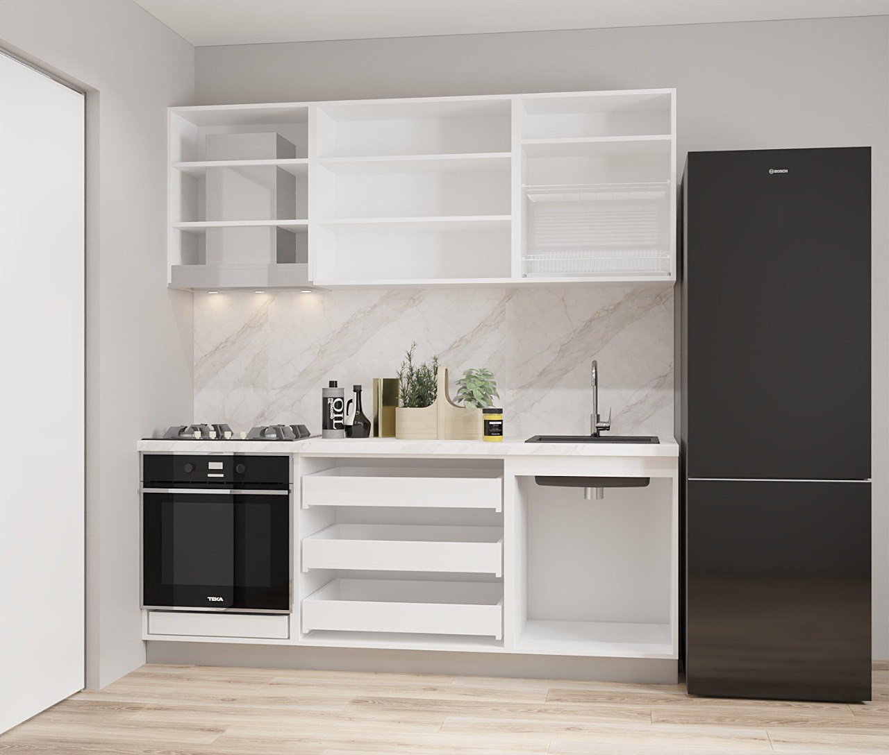 Bucătăria este compusă din module superioare și inferioare practice, care oferă suficient spațiu pentru depozitarea vaselor, ustensilelor de bucătărie și produselor. Datorită sistemului modular, construcția se adaptează ușor la necesitățile clientului.