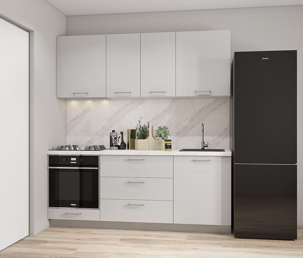 Bucătăria modulară modernă Relaxe Mini Nordic 2.0 m — o soluție practică pentru bucătării compacte și de dimensiuni medii. Designul minimalist, fronturile mate gri deschis și carcasa albă se integrează ușor într-un interior modern și creează o senzație de curățenie și spațiu.