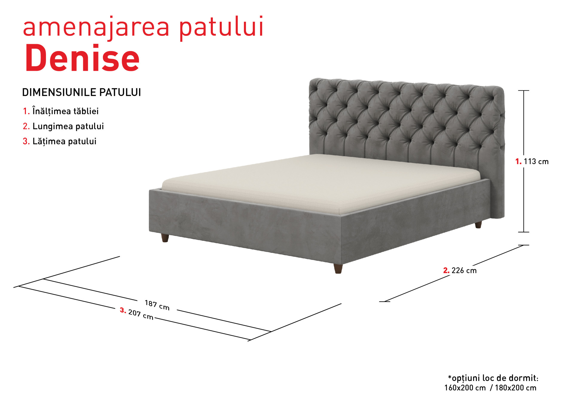 Setul format din patul dublu Denise și salteaua Camelia reprezintă o combinație echilibrată între eleganță clasică și inginerie modernă, fiind conceput pentru a oferi un somn odihnitor într-un cadru estetic rafinat. Patul Denise, de origine din Ucraina, se remarcă prin dimensiunile sale exterioare de 187 cm lățime și 226 cm lungime, oferind o prezență impunătoare în orice dormitor. Tăblia de cap are o înălțime de 113 cm, asigurând un sprijin confortabil pentru momentele de relaxare, în timp ce tabla de picioare măsoară 44 cm. Structura este susținută de picioare cu o înălțime de 11 cm, facilitând curățenia sub mobilier.