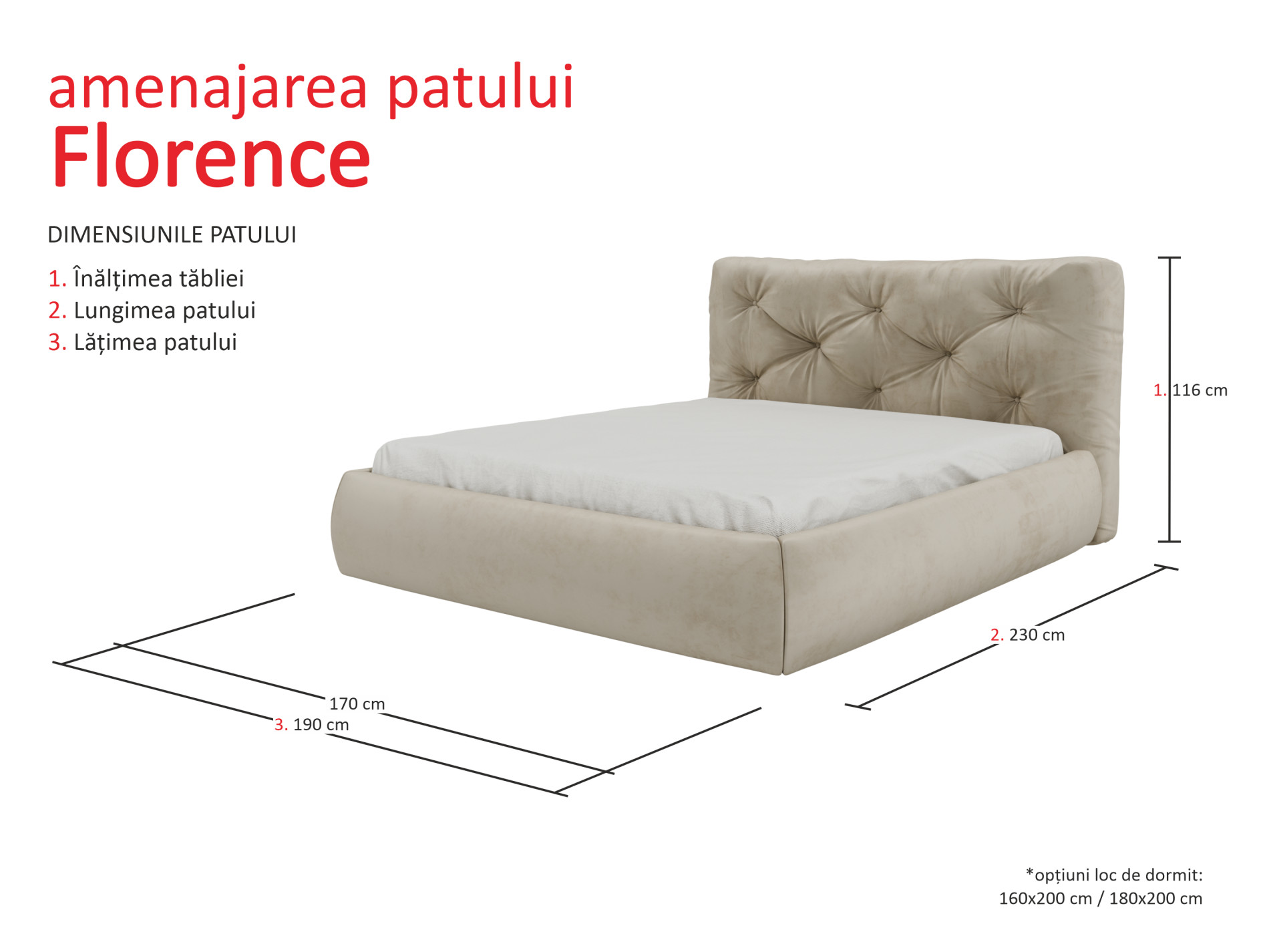 Dimensiunile exterioare ale patului sunt de 170 cm lățime și 230 cm lungime, ceea ce asigură un spațiu confortabil pentru două persoane. Partea de cap are o înălțime de 116 cm, oferind un sprijin comod atunci când citești sau te relaxezi, iar tabla de picioare are 34 cm. Piciorușele au o înălțime de 3 cm, iar tapițeria este realizată din stofă plăcută la atingere, care completează aspectul elegant al patului. Patul este produs în Ucraina.