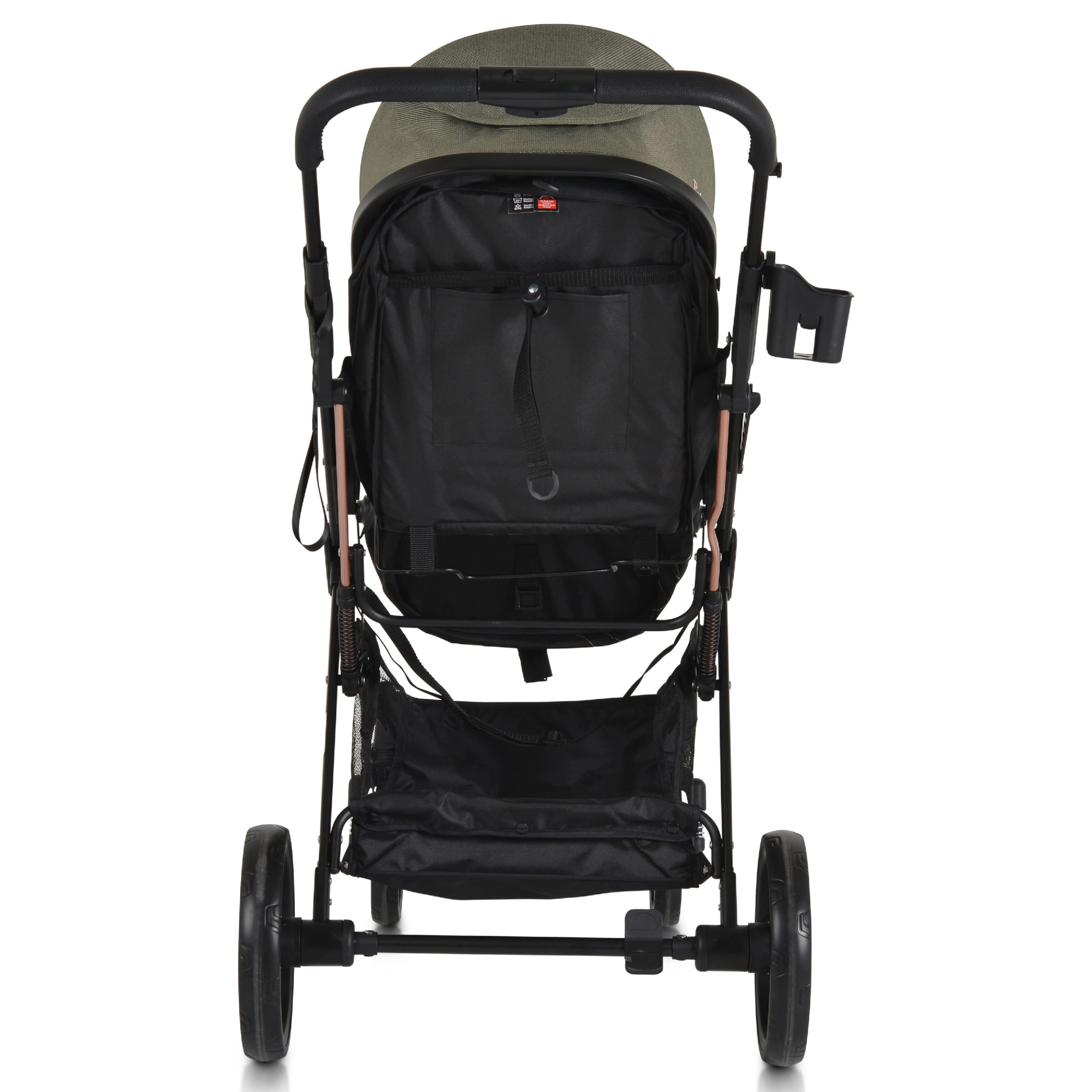 Căruciorul dispune de roți din față pivotante la 360° cu mecanism de blocare și amortizoare, precum și de roți spate mai mari, toate detașabile prin buton. Frâna este conectată pe roțile din spate. Coșul de cumpărături este spațios, cu capacitate de până la 2–3 kg, iar suportul pentru pahar adaugă un plus de funcționalitate.