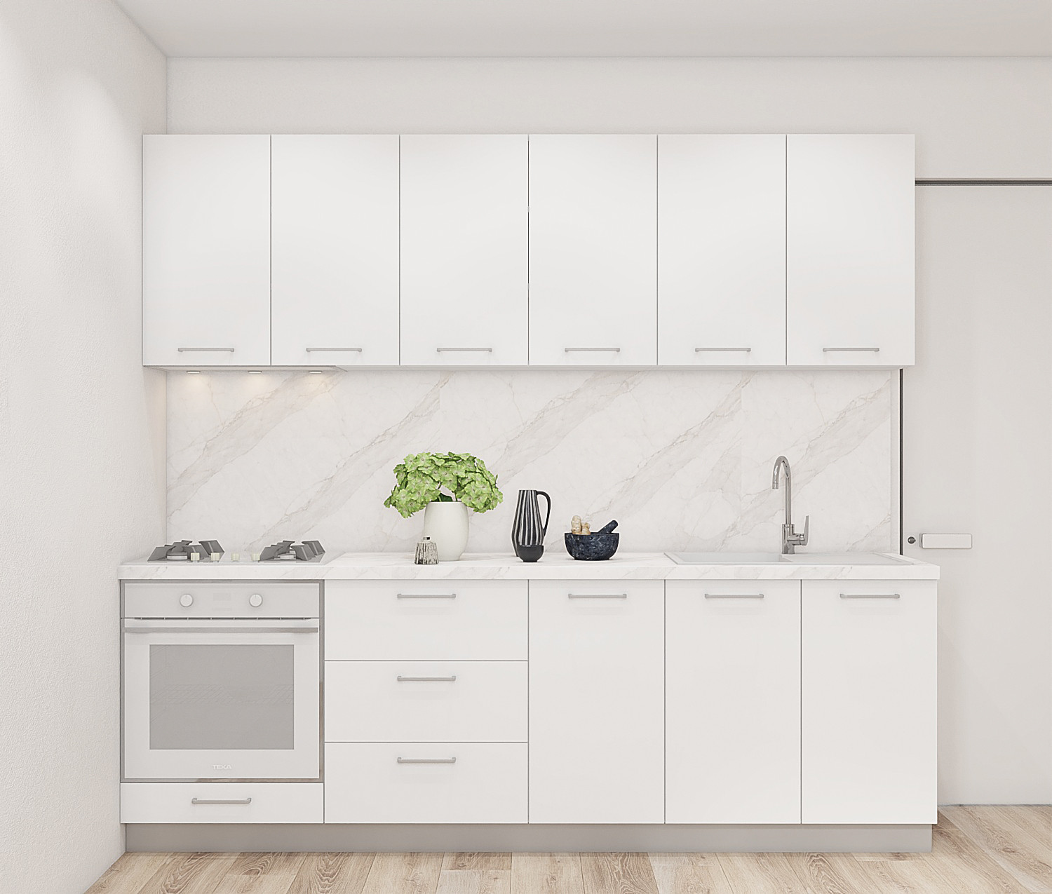 Standard Polar este definiția eleganței moderne și a unei eficiențe spațiale superioare. Această bucătărie liniară de 2,4 metri a fost concepută pentru a aduce un aer contemporan și sofisticat în locuința ta, mizând pe o paletă de culori neutră care maximizează senzația de spațiu și luminozitate. Fațadele cu finisaj catifelat în nuanțe de alb imaculat, puse în valoare de blatul cu textură nobilă de marmură Calacatta, transformă zona de gătit într-un punct central al designului interior.