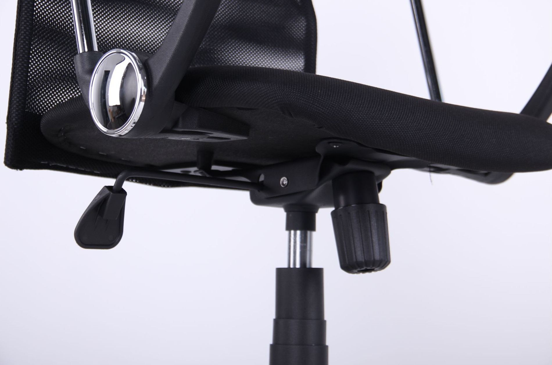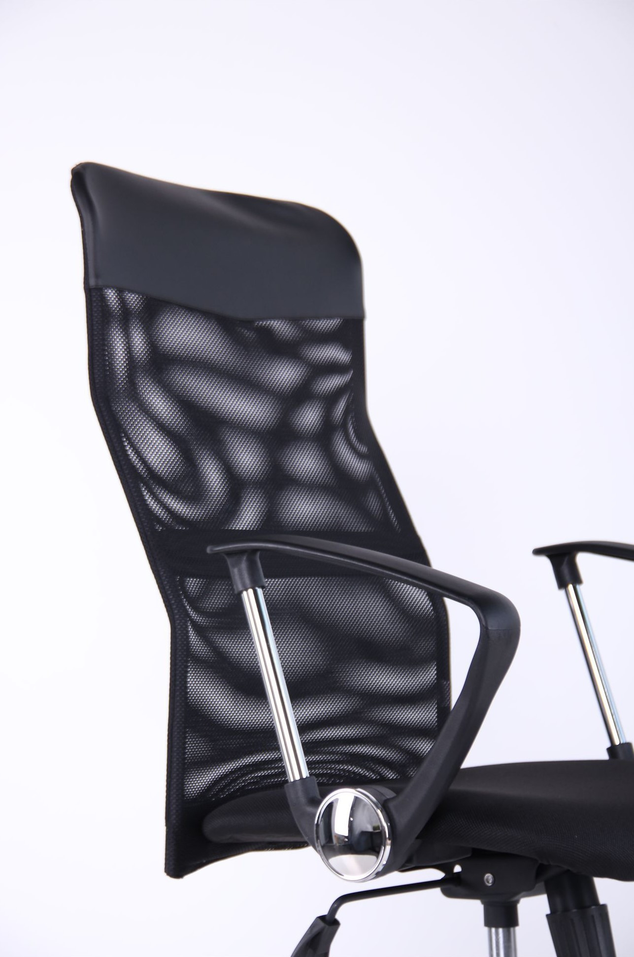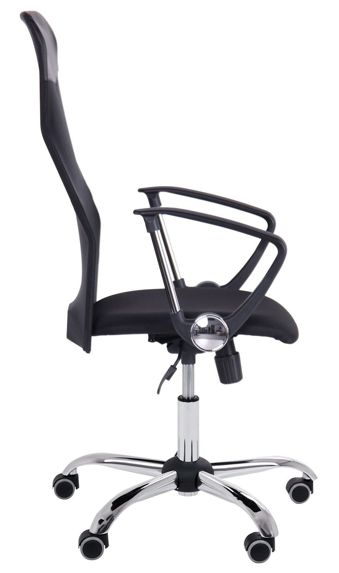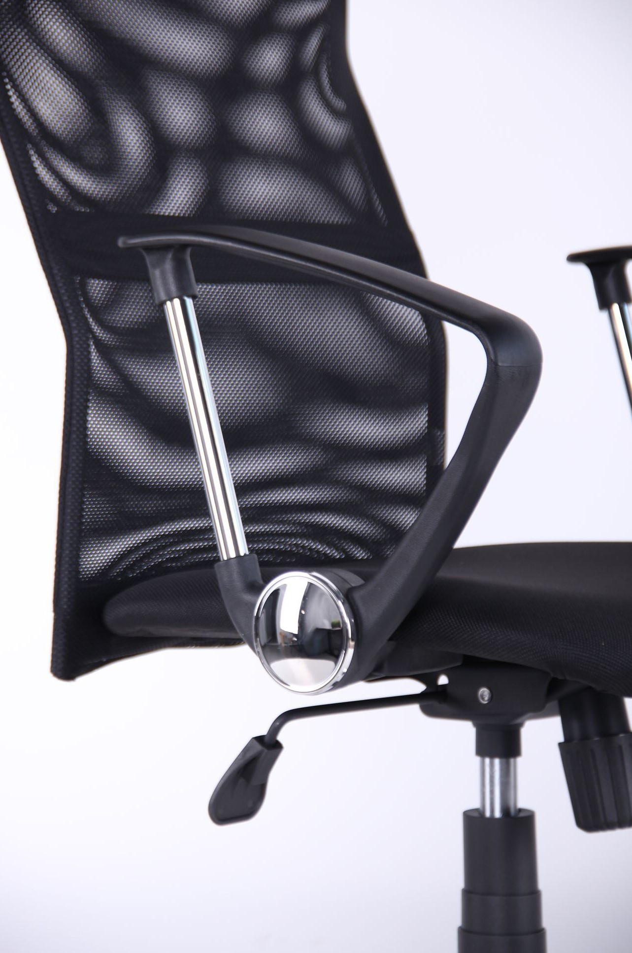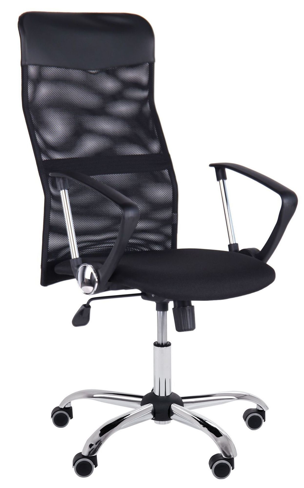 Fotoliul de birou Ultra Chrome combină designul ergonomic cu materiale rezistente pentru un confort optim. Spătarul este realizat din plasă neagră (Mesh), asigurând o ventilație excelentă, în timp ce șezutul este tapițat cu material textil A-01 durabil. Structura include o cruce cromată elegantă de 64 cm și role cauciucate silențioase, ideale pentru protejarea podelei.