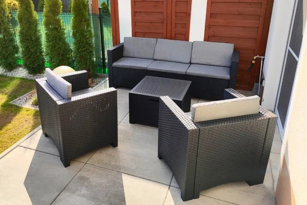 Изготовленный из полипропилена, этот набор мебели воспроизводит роскошный вид натурального ротанга, но обладает дополнительными преимуществами, которые делают его идеальным для использования на улице. Полипропилен — прочный и долговечный материал, способный противостоять солнечному свету, влаге и другим погодным условиям, сохраняя при этом свою привлекательность.
