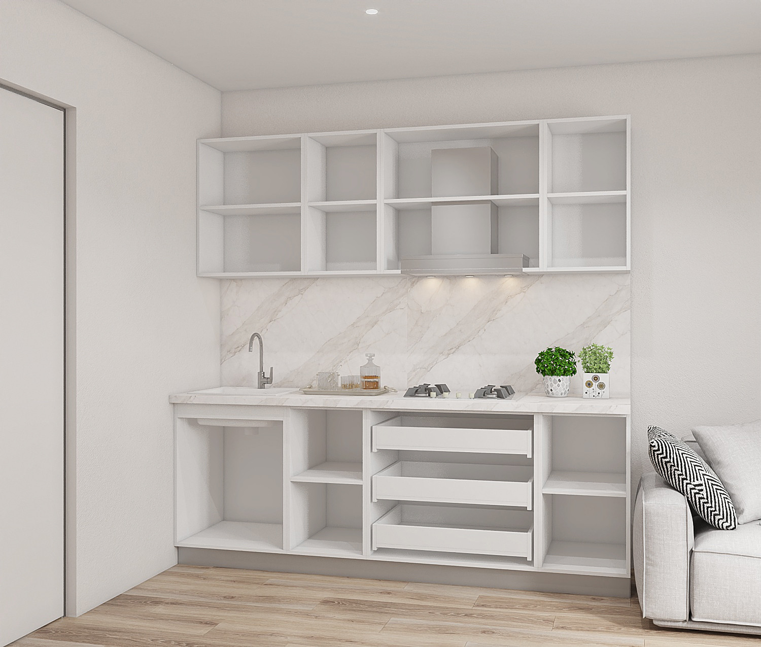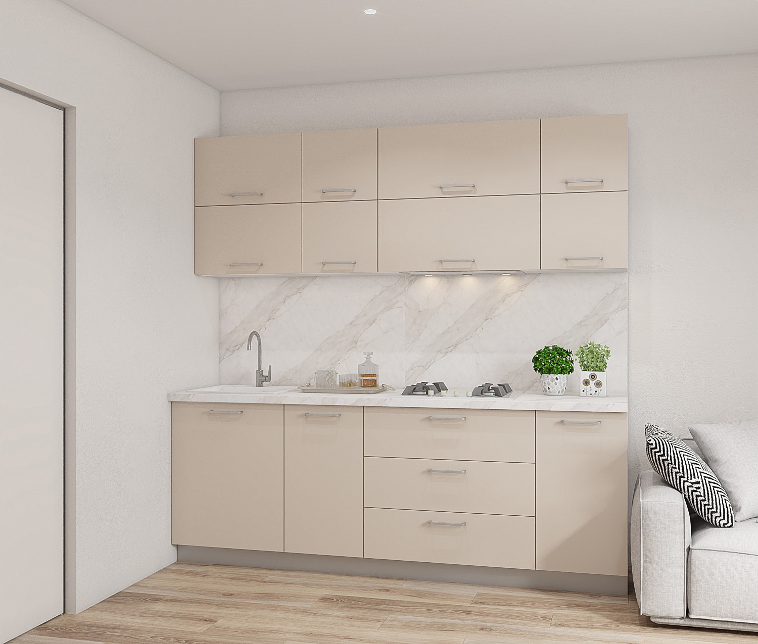 Compact Bej — это воплощение современной элегантности и превосходной пространственной эффективности. Эта линейная кухня длиной 2,2 метра была разработана, чтобы привнести атмосферу современности и изысканности в ваш дом, делая ставку на нейтральную цветовую палитру, которая максимизирует ощущение пространства и света. Фасады в дополняющих друг друга бежевых оттенках, подчеркнутые столешницей с благородной текстурой мрамора Calacatta, превращают зону приготовления пищи в центральный элемент интерьера.