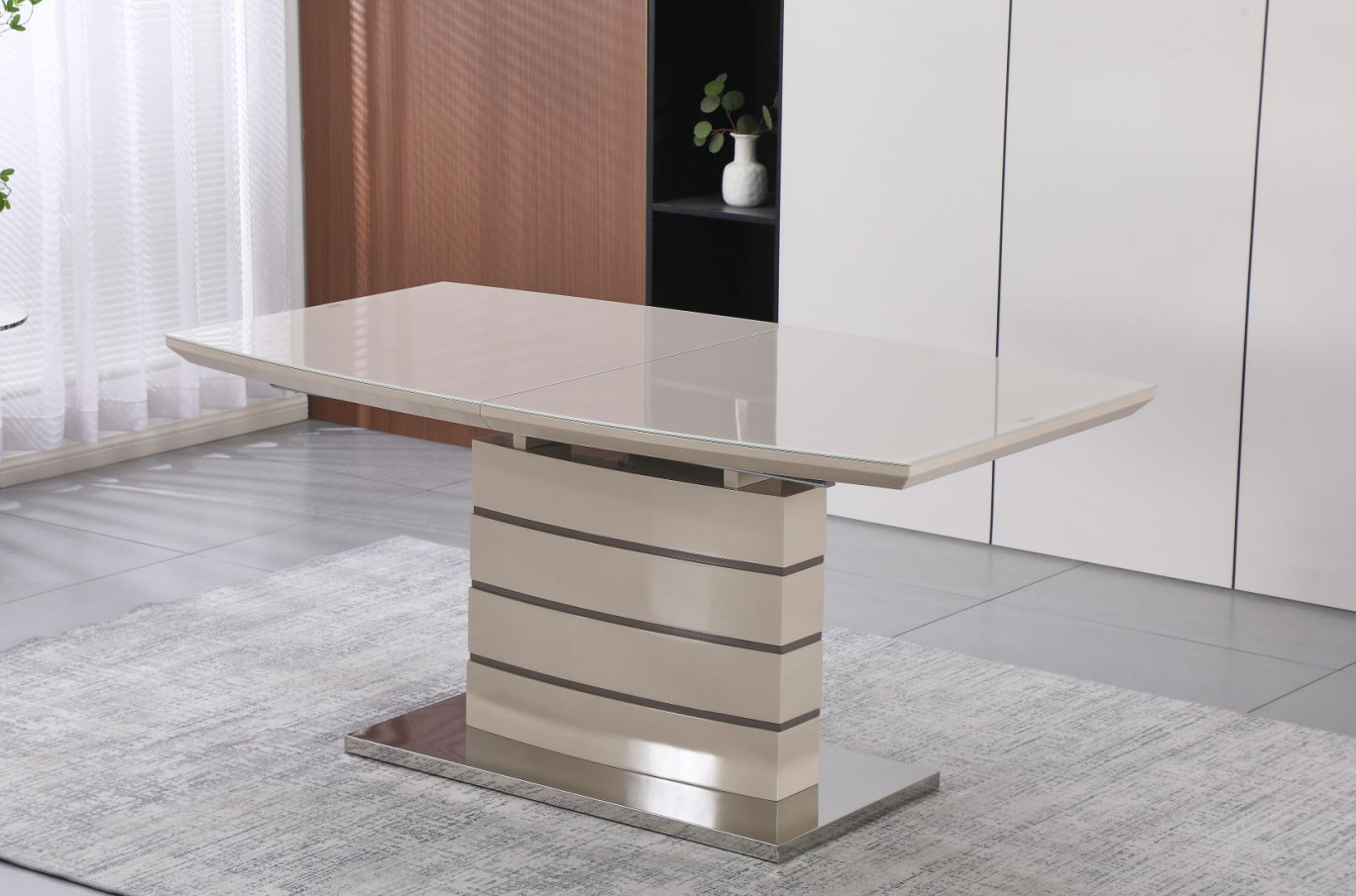 Раздвижной стол DT-2418 выделяется своим изысканным дизайном и прочной конструкцией. Столешница выполнена из элегантного сочетания МДФ и стекла, что придает ей современный вид, а вставка для расширения сделана из МДФ. Каркас с декоративными полосами и солидное основание с покрытием из блестящей нержавеющей стали добавляют нотку роскоши и устойчивости. Благодаря варьируемой длине от 160 до 200 см, стол идеально подходит для комфортного размещения большого количества гостей.