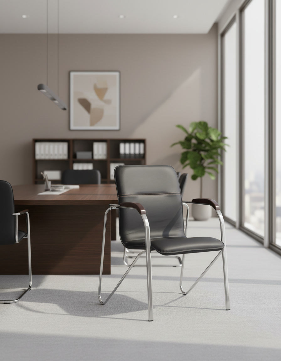 Samba - это портативное кресло, подходящее как для офисов, так и для залов ожидания, посетителей. Эта модель выполнена на основе хромированного железа, а сиденье и спинка обтянуты экологичной кожей, наполненной плотной губкой.