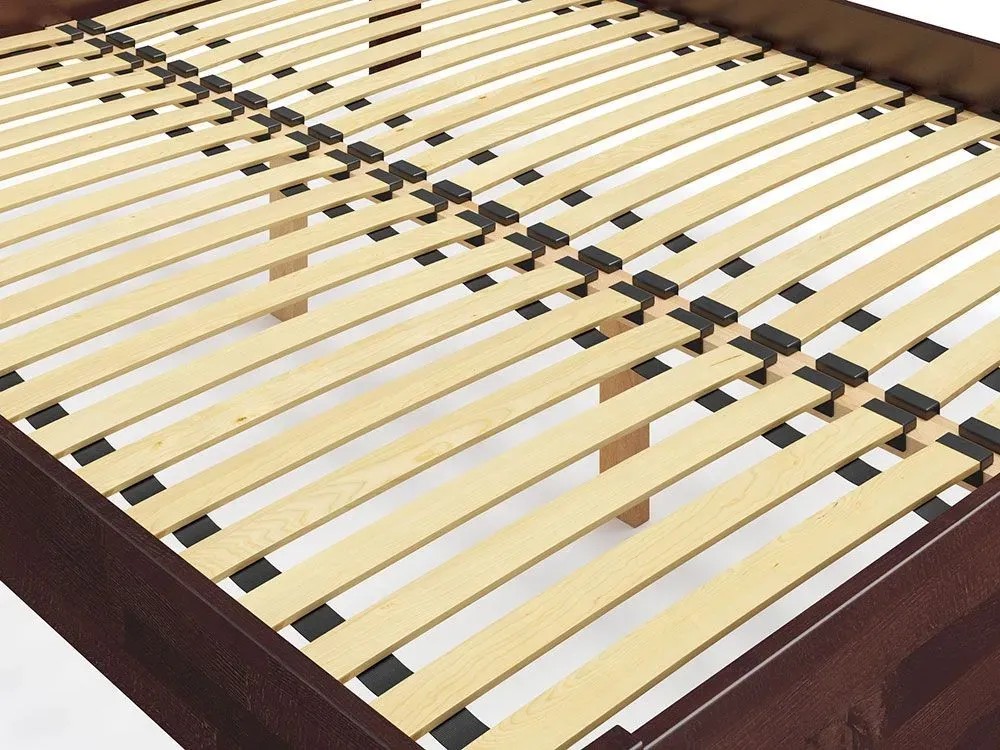 Кровать Селена оснащена 2 рядами ламелей по 19 штук в каждом. Такая конструкция обеспечивает качественную и удобную фиксацию матраса. Заботясь о длительном сроке использования кроватью, мы оснащаем ее фурнитурой от SISO и немецкого производителя Häfele. Благодаря качественной фурнитуре и основы из дерева кровать имеет долгий срок использования.