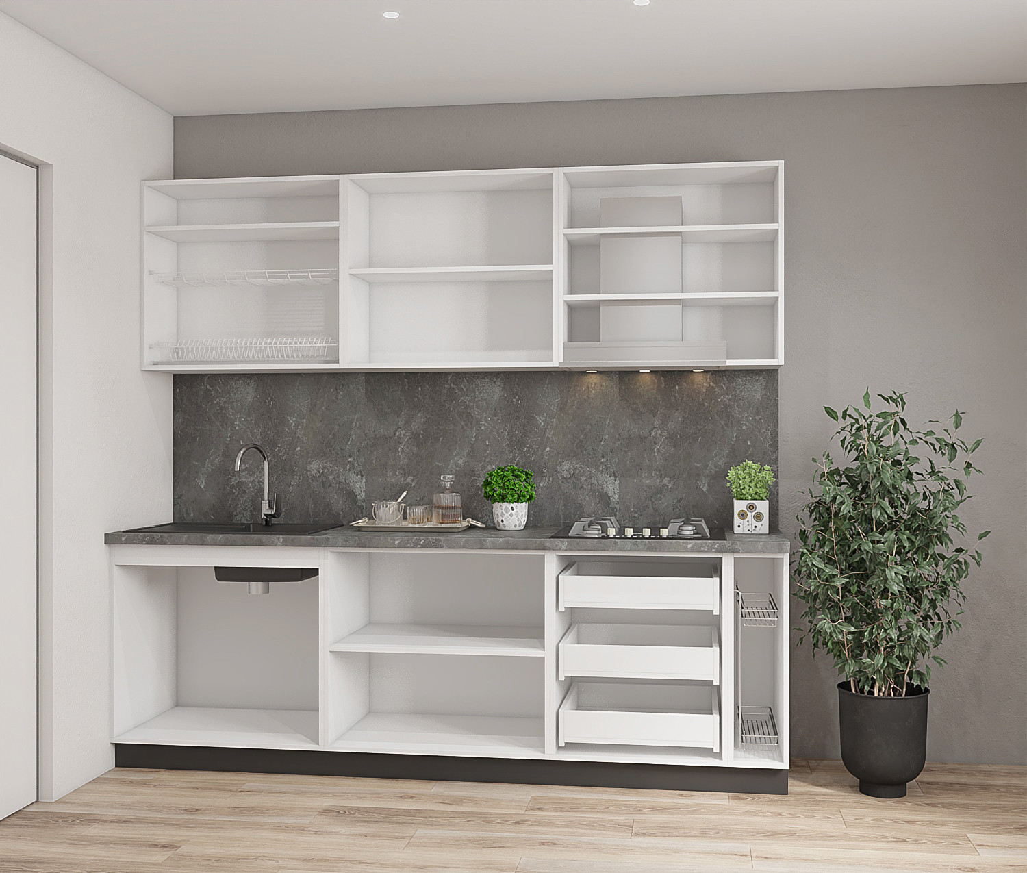 - Бытовая техника, мойка и элементы декора, представленные на визуализации, не входят в базовый комплект.