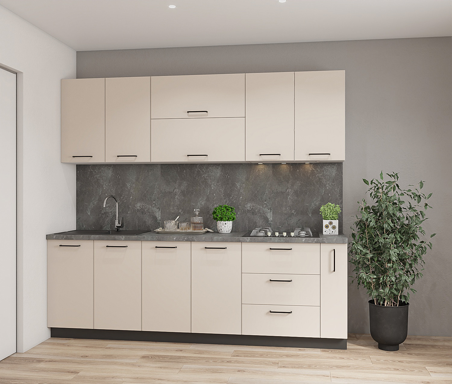 Standard Cream — это воплощение современной элегантности и превосходной пространственной эффективности. Эта линейная кухня длиной 2,4 метра была разработана, чтобы привнести атмосферу современности и изысканности в ваш дом, делая ставку на нейтральную цветовую палитру, которая максимизирует ощущение пространства и света. Фасады в деликатном бежевом цвете, подчеркнутые столешницей с благородной текстурой черного бетона, превращают зону приготовления пищи в центральный элемент интерьера.