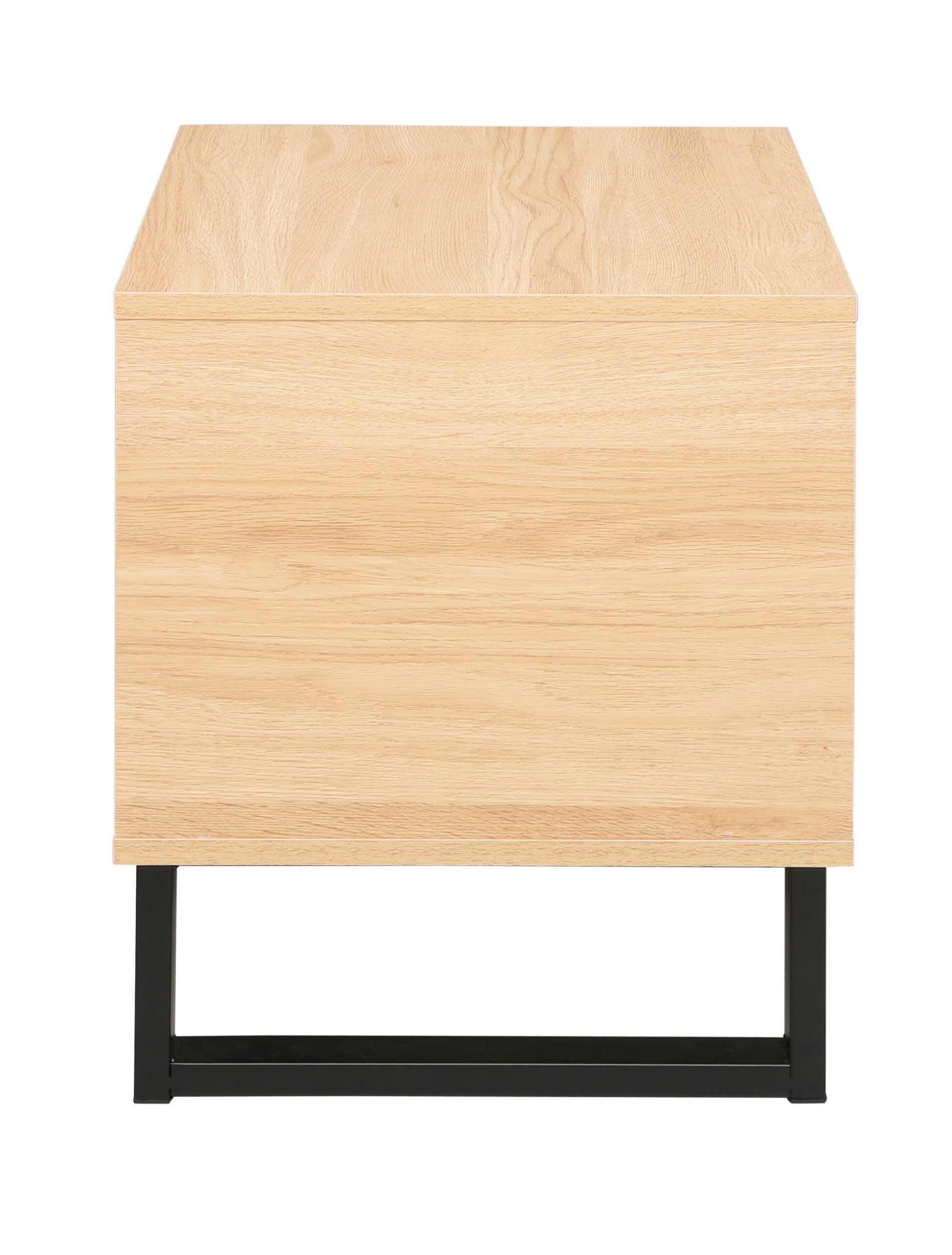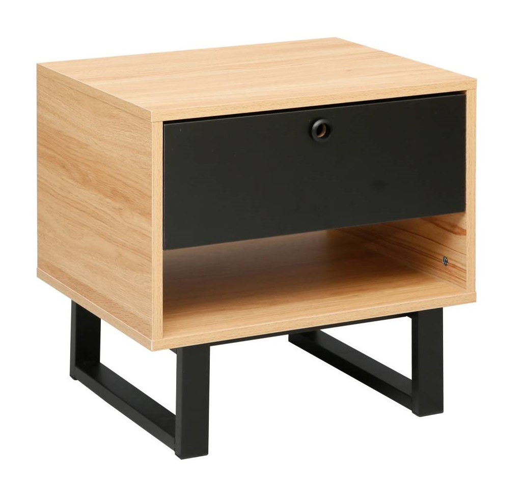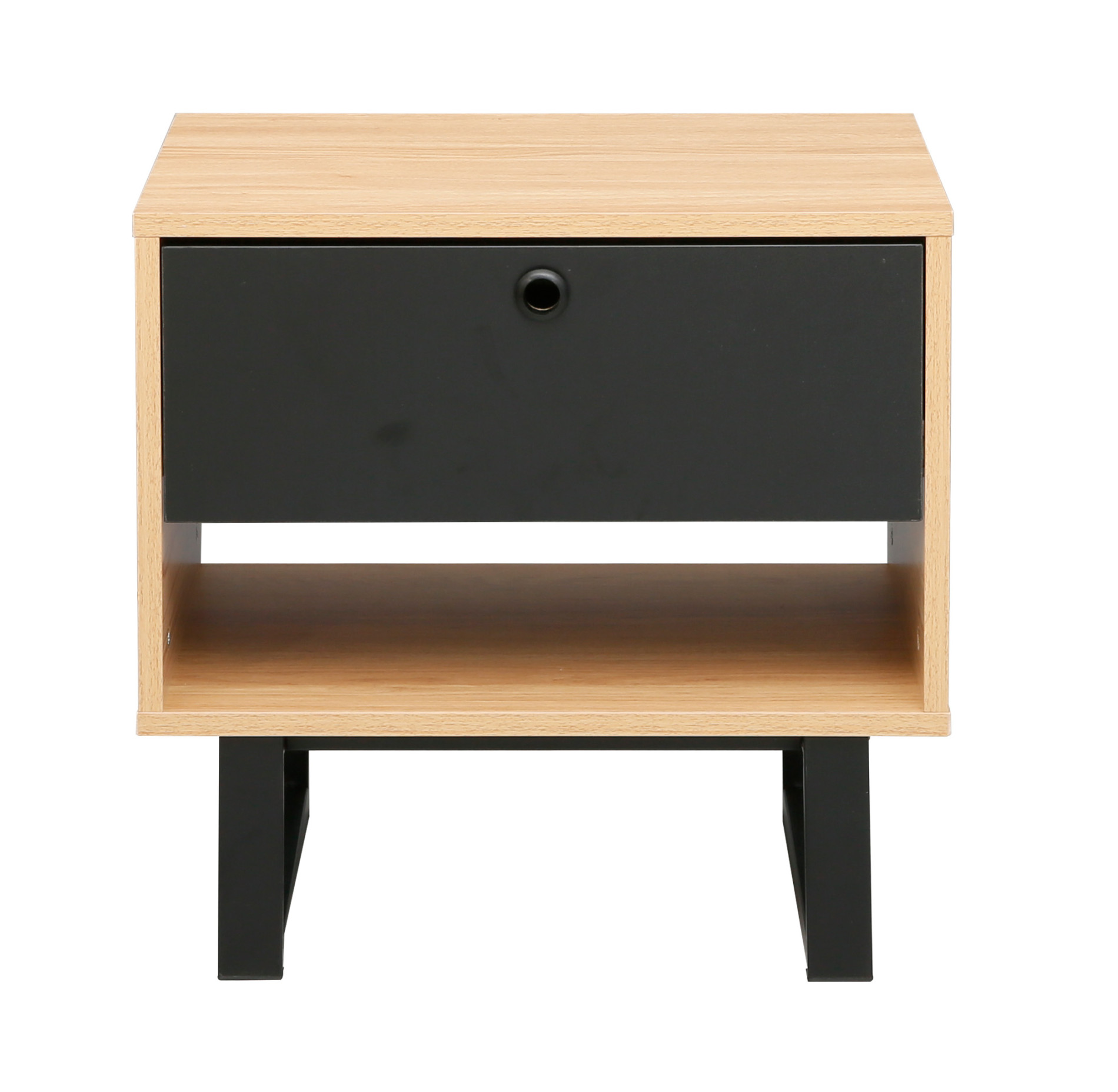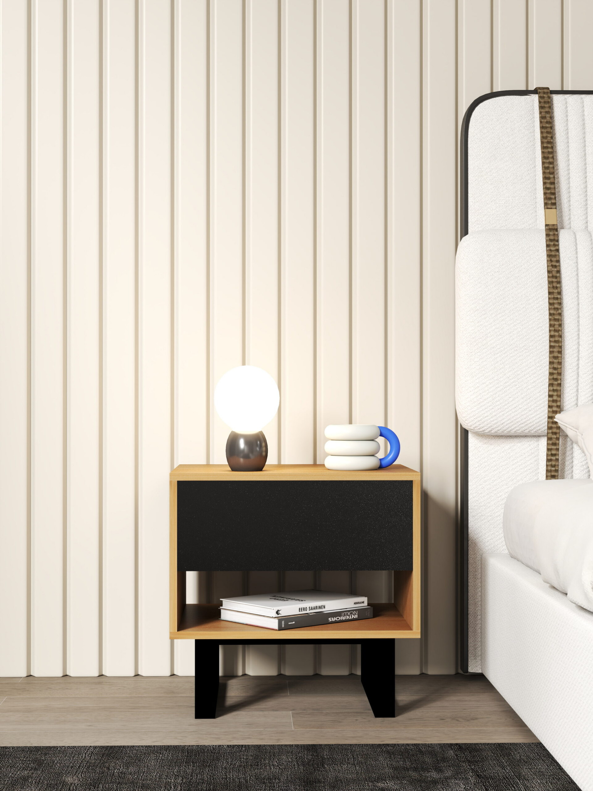 Конструкция дополнена металлическим каркасом, окрашенным методом порошкового напыления в чёрный цвет P02, который обеспечивает устойчивость и создаёт приятный визуальный контраст с древесной текстурой. Тумбочка оснащена вместительным выдвижным ящиком и открытой полкой, удобными для хранения аксессуаров, пультов дистанционного управления и других предметов повседневного использования.