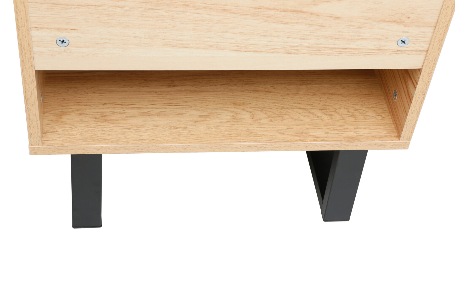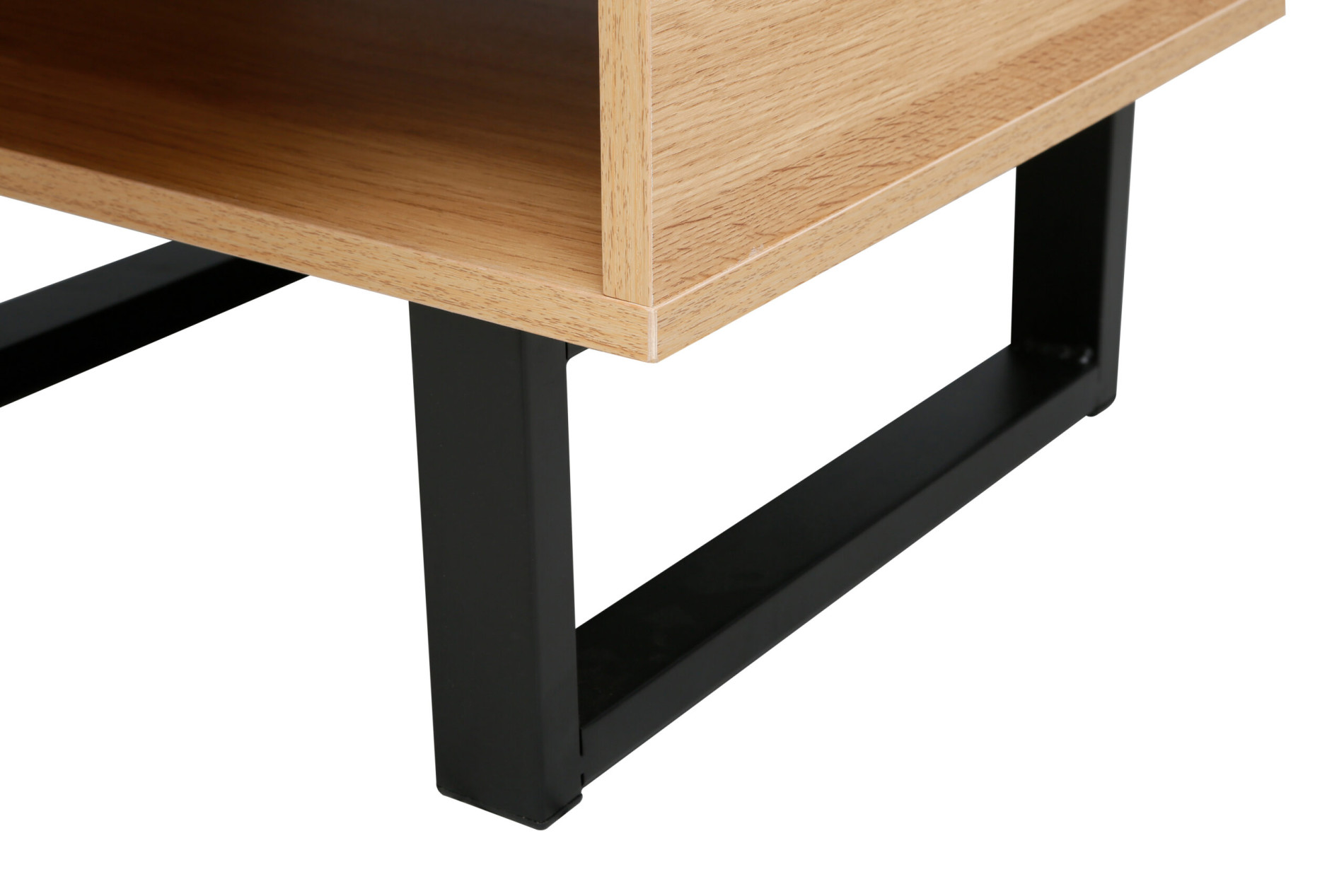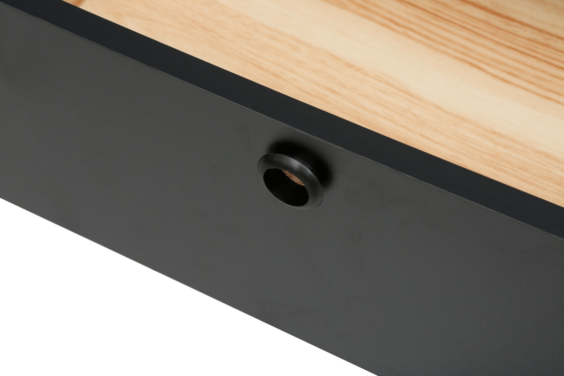 Конструкция дополнена металлическим каркасом, окрашенным методом порошкового напыления в чёрный цвет P02, который обеспечивает устойчивость и создаёт приятный визуальный контраст с древесной текстурой. Тумбочка оснащена вместительным выдвижным ящиком и открытой полкой, удобными для хранения аксессуаров, пультов дистанционного управления и других предметов повседневного использования.